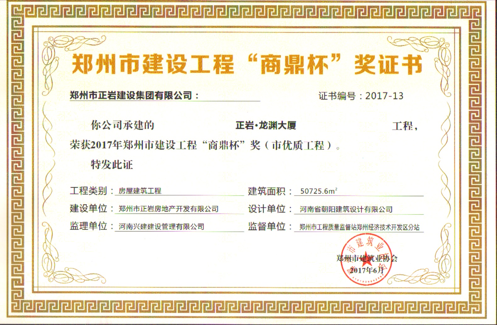2017承建正巖龍淵大廈榮獲鄭州市建設(shè)工程商鼎杯獎(jiǎng)